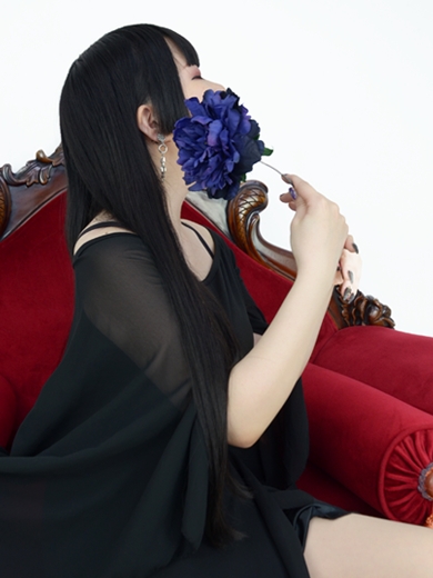 シルクのような白い肌に腰まで伸ばした美しい黒髪、ブラック基調のフォーマルファッション。